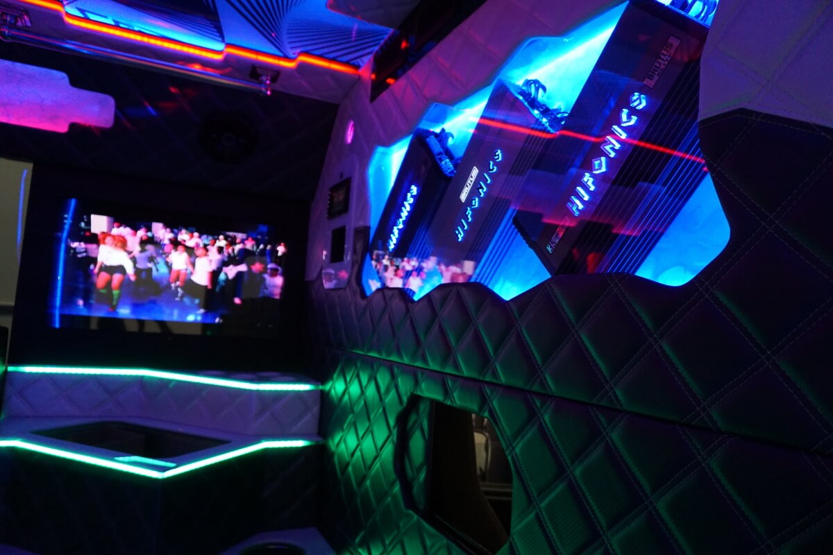 Add to that our state-of-the-art CD/MP3/DVD/iPod/ and AM-Fm radio sound system blasting out your favorite tunes through 15,500-watt speakers, and you can be guaranteed we will put you right in the party mood without fail.
