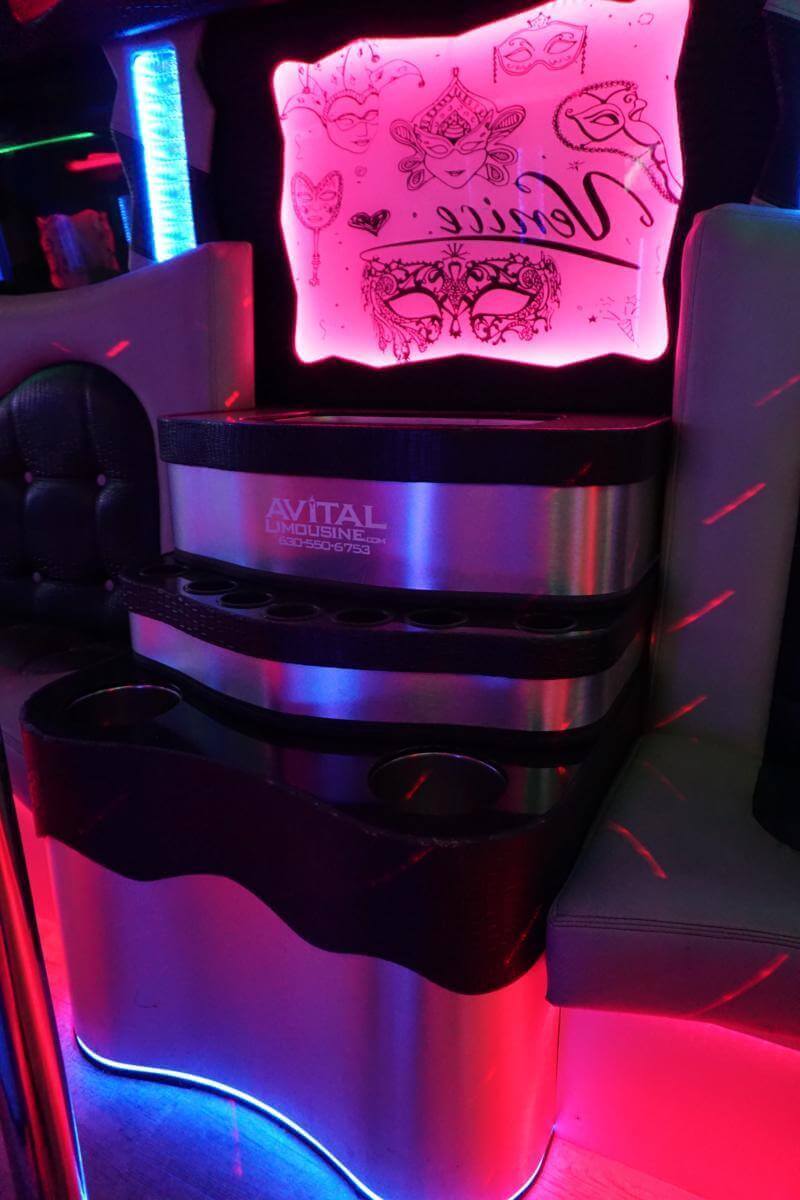 Our chauffeur-driven “Venice Edition” Party Bus will do just the job. It seats comfortably 28 passengers in luxurious three color leather settee comfort!